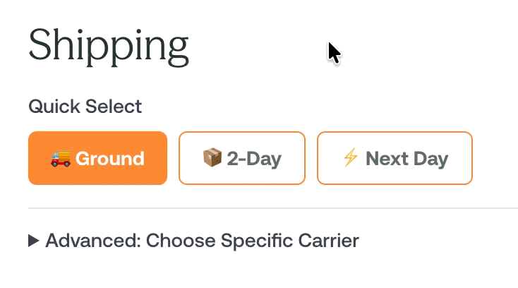 next_day or a carrier ups and service level of ups_ground — they will override default shipping preferences for this specific order.2025-10-28