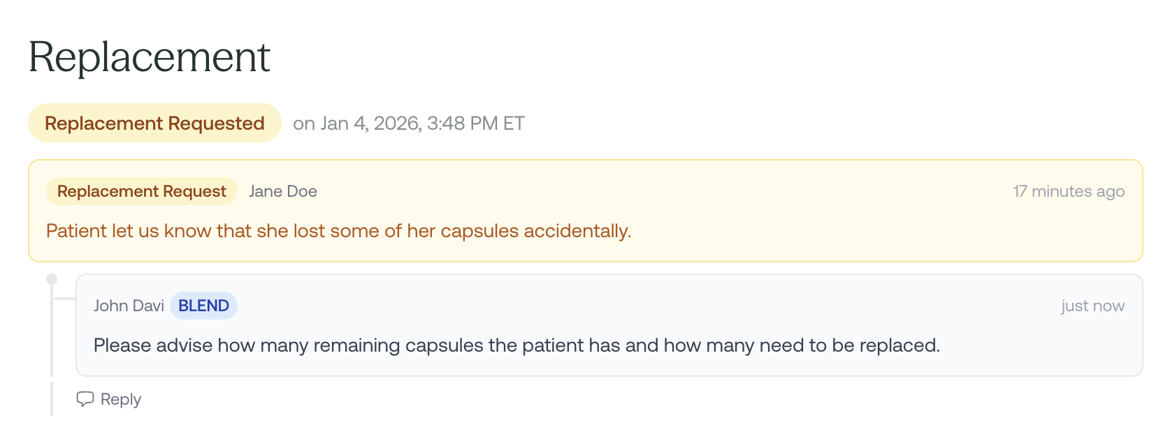 If you request a replacement order, and Blend pharmacy staff requires more information, you will be notified via email and can correspond within the Order page.