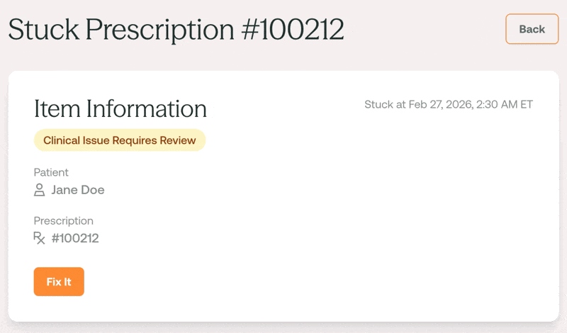 - Order Missing: A prescription has been created but no order has arrived for the prescribed product. This will present as stuck only after 72 hours have elapsed. Will resolve when an order has been created or when the prescription is cancelled.